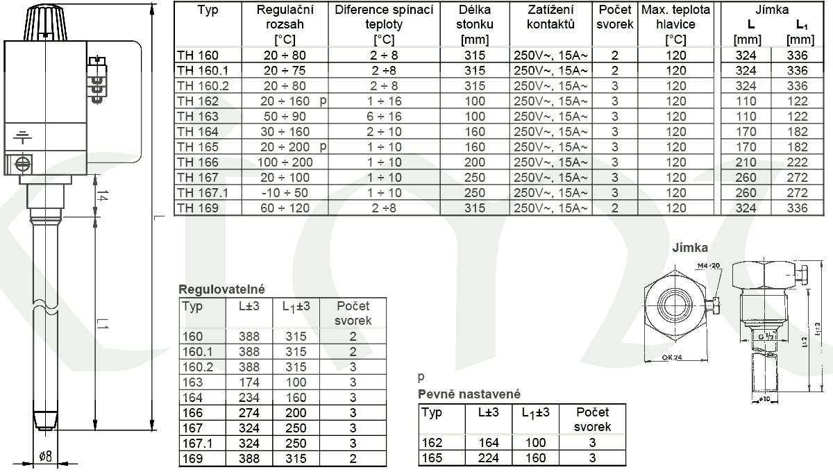 Termostaty řady TH 160 jsou tepelně závislé jednopólové spínače, založené na principu nestejné teplotní dila­tace dvou různých kovů. Jsou určeny pro spínání elektrických obvodů, ale nikoliv jako hlavní spínače. Základem termostatů je spolehlivý mechanický systém, který nemá žádnou vlastní spotřebu energie. Termostaty se vyzna­čují vysokou odolností proti mechanickému poškození a nízkými náklady na provoz a údržbu.