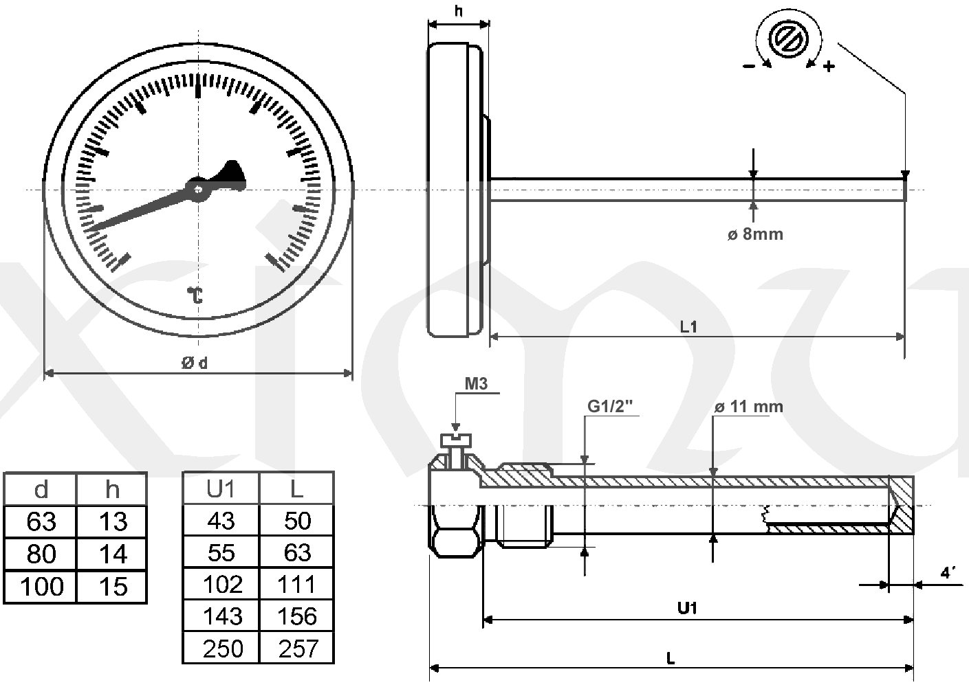 Teploměr bimetalový přímý, zadní stonek, včetně mosazné jímky se závitem G1/2", L=60mm
