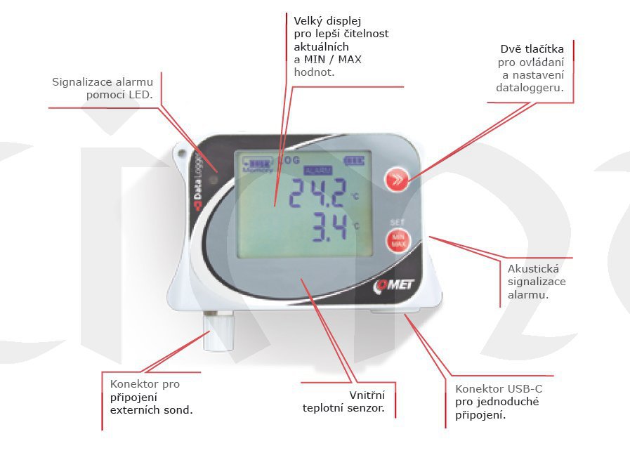 Záznam je prováděn do energeticky nezávislé elektronické paměti. Údaje lze kdykoli přenést do osobního počítače přes rozhraní USB-C.