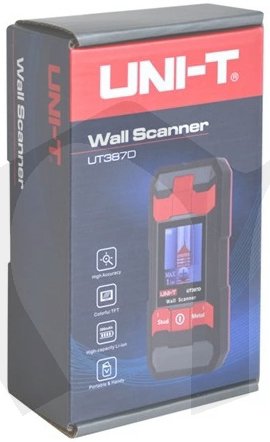 Skener UT-387D je určený pro detekci různých nehomogenit ve zdi nebo za sádrokartonovou stěnou - například železných a neželezných (měděných, mosazných) trubek, výztuže v betonu, nerezová nemagnetická ocel, elektrických drátů bez napětí i s el. AC napětím, dřevěných latí a špalíčků. Detekce probíhá na základě principů elektromagnetické indukce. Skener obsahuje barevný indikační displej s úhlopříčkou 1,8", který zobrazuje nastavené režimy práce a přibližnou hloubku předmětů. Další specifikace předmětů je hlasová (v angličtině). Napájení skeneru je provedeno nabíjecím Li-Ion akumulátorem 3,7V/300mAh, který má životnost přibližně 3000 nabití a vybití.