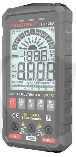 HT-126A je chytrý a odolný multimetr od společnosti Habotest. Vyznačuje se přesností měření, můžete jej používat i ve venkovním prostředí. Je vybaven velkým displejem a silikonovými tlačítky - jeho používání je jednoduché a pohodlné. Je kompaktní a lehký - má také LED svítilnu, která vám umožní pracovat i na tmavých místech. K napájení potřebuje 4 baterie AAA 1,5V. Ty však nejsou součástí balení a je nutné je zakoupit zvlášť. Můžete jej použít k měření napětí, odporu, kapacity atd.
