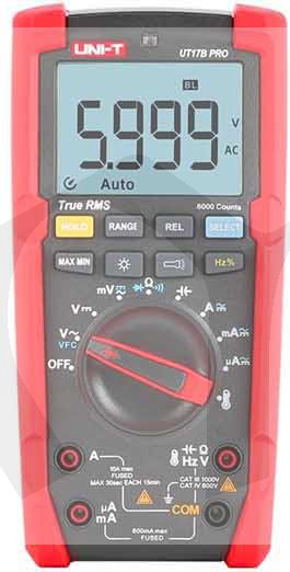 Digitální multimetr UT17B PRO 1000 V True RMS je vysoce spolehlivý, bezpečný a odolný multimetr, měřící skutečné hodnoty RMS, určený i pro měření v rozvodných zařízeních kategorie CAT III 1000 V / CAT IV 600 V. Multimetr je vybaven vestavěným filtrem VFC a dokáže odfiltrovat rušení vznikající například na měničích napětí, což vede k přesnějšímu odečtu napětí.