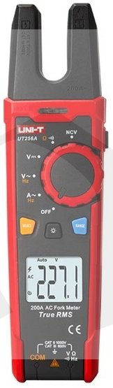 Digitální multimetr UT 256A je bezpečný a spolehlivý vidlicový měřicí přístroj pro měření skutečných efektivních hodnot (RMS) napětí a proudů, který může nahradit klešťový multimetr. Nemá žádné mechanicky pohyblivé díly a z toho vyplývá jeho odolnost proti mechanickým poruchám. Přístroj má displej s maximální zobrazitelnou hodnotou 6000. Pomocí vidlice s Hallovou sondou umožňuje měření střídaveho proudu až do 200A. Pomocí přiložených měřících kabelů je dále možné měřit střídavé a stejnosměrné napětí, odpor, spojitost vodičů, má zabudovaný bezkontaktní snímač střídavého elektrického napětí (NCV) a zabudovanou svítilnu. Má funkce pozastavení dat, automatickou a manuální volbu rozsahu, podsvícený displej, měření frekvence, indikaci vybité baterie. Maximální průměr drátu, který lze vložit do vidlice je 15mm. Indikace překročení rozsahů červenou LED, u NCV akustickým signálem. Výhodou je odolnost proti pádu z výšky až 2m. Napájení dvěma bateriemi 1,5 V AA. Tyto vlastnosti činí z multimetru UT256A praktický přístroj pro každodenní práci silnoproudých elektrikářů.