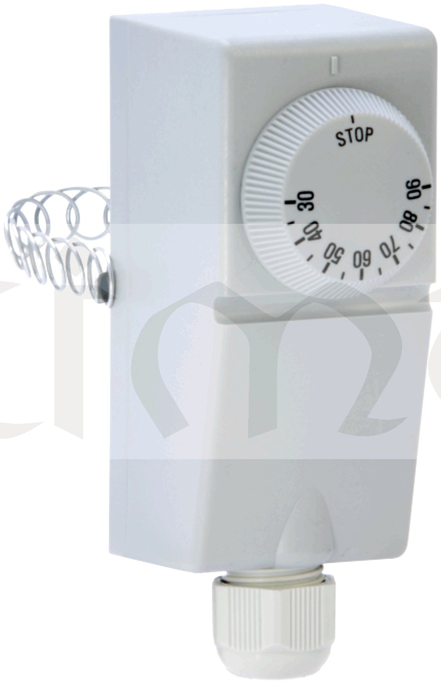 Jednopólový zakrytovaný termostat pro ovládání teploty využívající roztažnosti tekutiny, vybavený průchodkou kabelů a přepínacím kontaktem.