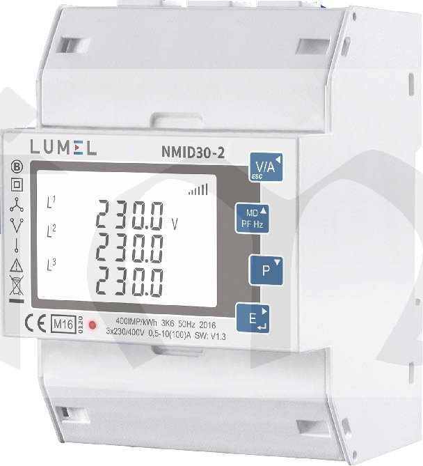 Elektroměr NMID30-2 je moderní zařízení určené ke sledování základních elektrických parametrů. Byl navržen pro 1fázové a 3fázové sítě a vybaven impulzním výstupem a digitální linkou RS-485 pro dálkové monitorování měřených parametrů nebo systémů BMS. Podsvícený displej umožňuje zobrazit až 16 různých měřených hodnot. Displej lze konfigurovat pomocí tlačítek. Shoda se směrnicí MID (moduly B + D)