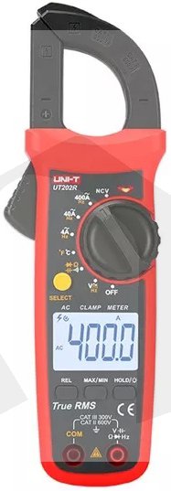 Digitální klešťový měřič UT 202R slouží pro měření střídavých a stejnosměrných napětí do 600V, AC proudů do 400A a frekvece napětí do 600V. Na všech rozsazích má ochranu před větším napětím než 600V a zvukový a optický alarm. Čtyřmístný více segmentový displej o rozměru 37 x 25 mm se zadním podsvícením a rychlou obnovovací frekvencí (3krát/s) . Rozevření čelistí umožňuje měření na kabelech o průměru až 28mm. Bezkontaktní snímání elektrického pole (NCV) umožňuje detekovat vodiče pod napětím ve dvou citlivostech -EFLo a - EFHi pro rozvody nn 110V/50/60Hz a 230V/50/60Hz. Přiložená sonda - kryt hrotů na testovacích kabelech umožňuje měření na rozvodech nn v kategorii CAT III bez nebezpečí vzniku oblouku. Bez krytů na hrotech lze měřit testovacími kabely jen na rozvodech nn kategorie CAT II.