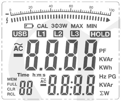♦ měří V, A, kW, kVA, kVAR, PF,  cosfi, kWh, Hz