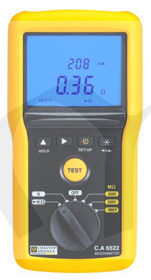 Měřič izolace C.A 6522, 2ks měřicí vodiče 1,5m, měřicí hrot černý, krokosvorka červená, brašna, 6ks baterie 1,5V a návod k obsluze.