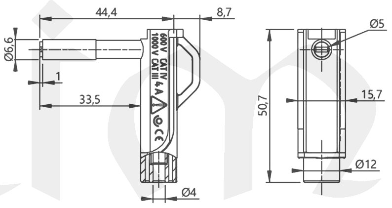 IEC 61010-031, Jmenovité napětí: 1000 V CAT II / 1000 V CAT III / 600 V CAT IV, zesílená izolace, stupeň znečištění 2.