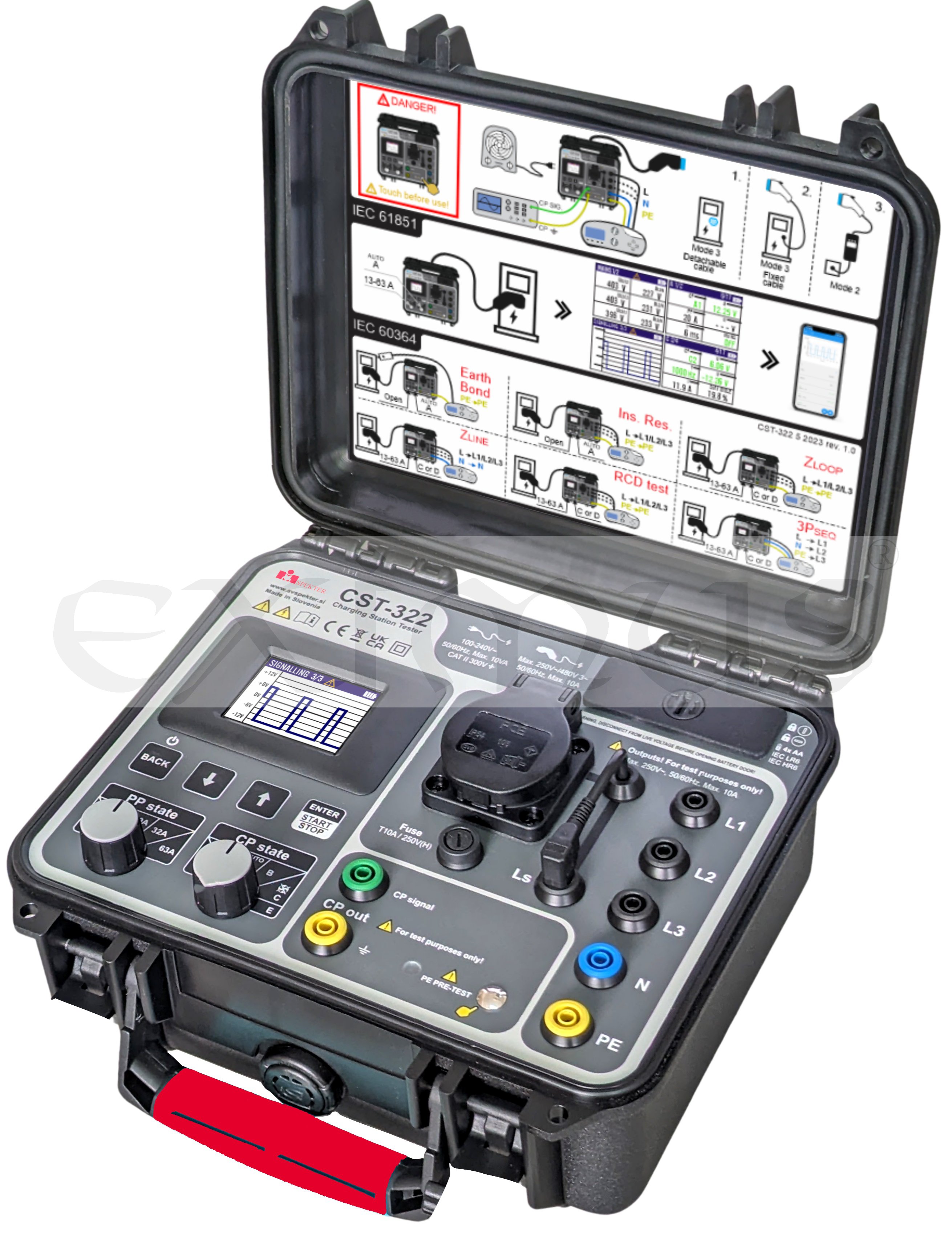 Analyzátor nabíjecích stanic pro elektromobily CST-322 je navržen v souladu s normami IEC/EN 61851-1 a IEC/HD 60364-7-72.