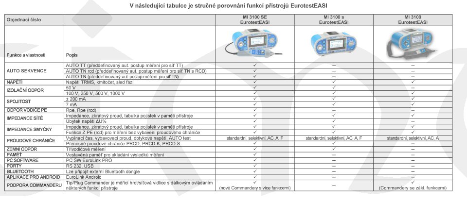 MI 3100 SE Eurotest EASI je nová verze oblíbeného multifunkčního testeru rozvodů nn, určená pro prvotní i periodické testování domácích a průmyslových instalací - jednofázových i vícefázových - kompletní test podle normy EN 61557. MI 3100-SE je navržen pro testování TT, TN, IT systémů, a také medicínských instalací. Novinkou jsou předdefinované mini autosekvence: TT (U, Zln, Zs, Uc); TN/RCD (U, Zln, Zs, Rpe); TN (U, Zln, Zlpe, Rpe); IT (U, Zln, Isc, Isfl, IMD). Další novinkou je např. test RCD i pro typ F a bluetooth komunikace.