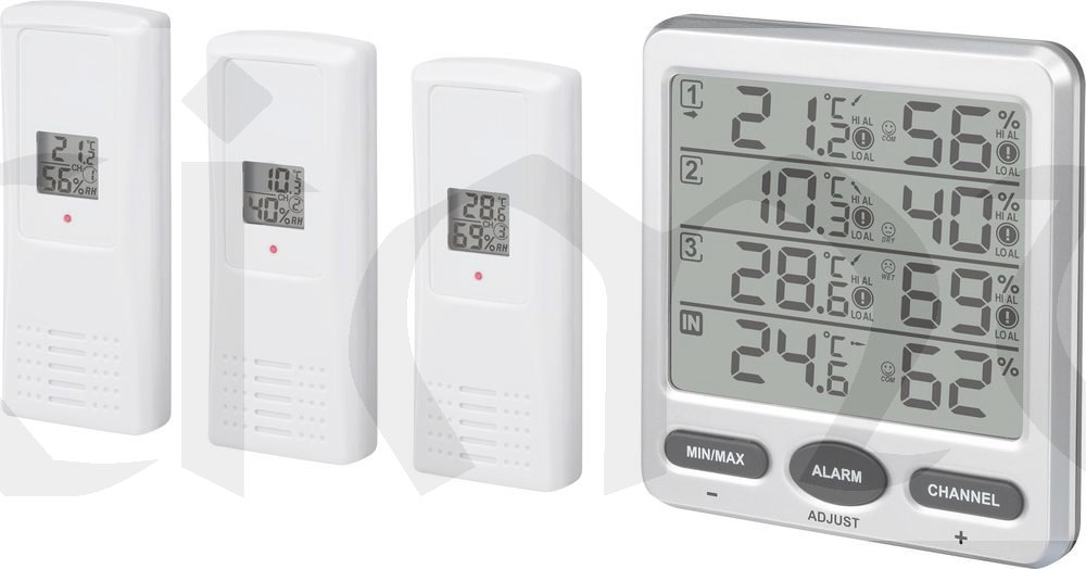 Vnější senzory přenášejí naměřené hodnoty do základní stanice. V základní sestavě jsou tři senzory a lze připojit až 5 dalších venkovních senzorů.