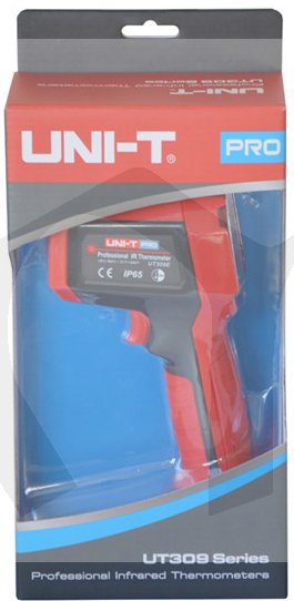 Profesionální bezkontaktní infračervený teploměr UT-309E (dále jen teploměr) může určit povrchovou teplotu měřením infračervené energie vyzařované cílovým povrchem. UT309E může měřit teploty od -35°C do 850°C. Měření v poměru ( vzdálenost : ploše ) 20 : 1. Je možno uložit až 99 souborů dat a provádět plánovaná měření s maximálním intervalem 96 hodin mezi dvěma měřeními. Tento teploměr má také krytí IP65 a vydrží pád až z 3 metrů. Duální laser pro zaměření objektu. Nastavení emisivity tepla měřeného objektu dle skutečnosti. Vysoce kontrastní barevný displej.