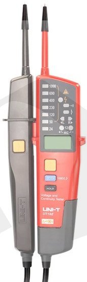 ZkoušečkaUT-18E. Tester ze série UT18 je navržen pro testování střídavého / stejnosměrného napětí (až 1000 V), třífázového napětí, sledu fází, kontinuity a dalších. Tato řada je zařazena do kategorie CAT IV 600V a splňuje standard krytí IP65. Zkoušečka napětí je navržena tak, aby usnadnila práci elektrikářům, technikům a dalším odborníkům pracujícím s elektřinou ve všech prostředích.