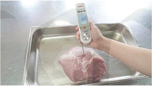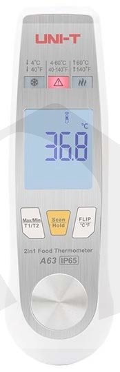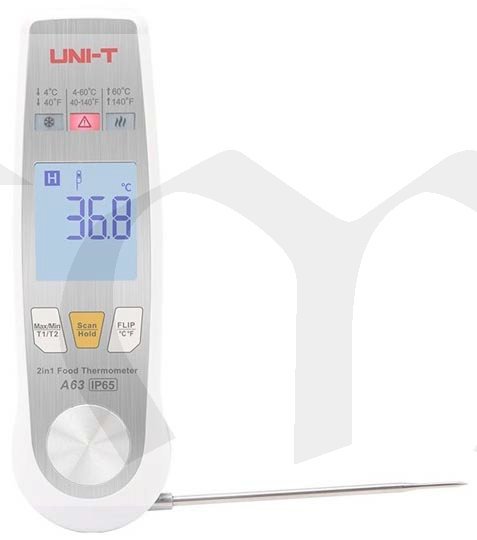 Potravinářský teploměr A-63 ( 2v1 ) , je potravinářský teploměr kombinovaný s infračerveným senzorem a skládací sondou. Poskytuje ideální řešení pro měření a monitorování teploty pro profesionály v potravinářském průmyslu. Infračervený režim dokáže rychle snímat povrchovou teplotu předmětů a režim sondy se používá pro přesné měření vnitřní teploty potravin. Má indikátor teplotního rozsahu, tato funkce se hodí pro HACCP (analýza rizik a kritický kontrolní bod), aby byla zajištěna bezpečnost potravin. Tento teploměr je vhodný pro zpracování potravin, přepravu potravin, skladování, stravovací průmysl a další.