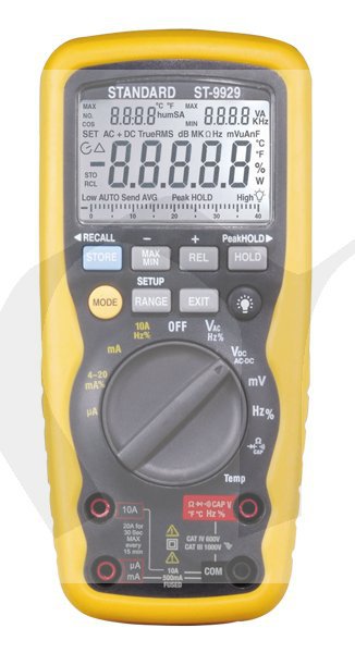 Profesionální True RMS multimetr ST 9929 (DT 9929) ve velmi odolném provedení. Přístroj disponuje velkým množstvím funkcí a velkým, dobře čitelným LCD displejem. Kromě běžného měření napětí, proudů a odporu je možné měřit také proudovou smyčku 4-20mA, frekvenci, kapacitu, teplotu...Multimetr je opatřen gumovým obalem, který zabezpečuje jeho odolnost.