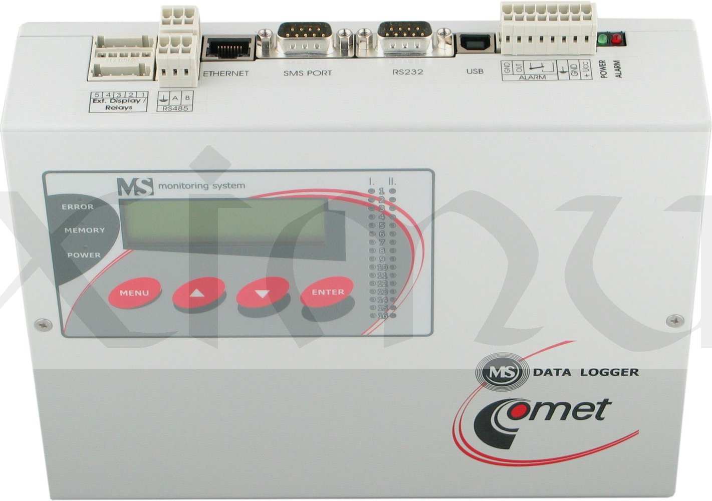 Monitorovací systém s měřicí ústřednou. Kompletně vybavená ústředna, dvouřádkový alfanumerický LCDdisplej, čtyři ovládací tlačítka, 32 alarmových LED svítivek. Šestnáctivstupý monitorovací systém je určen pro sběr dat ze snímačů nejrůznějších veličin, signalizaci alarmových stavů, případně pro řízení dalších procesů. Měřicí ústřednou lze měřit a zaznamenávat analogové veličiny, frekvenci, počítat impulsy, vyhodnocovat dvoustavové veličiny a načítat údaje ze zařízení pracujících s protokolem ModBus RTU nebo Advantech. Údaje lze kdykoli přenést do osobního počítače přes rozhraní USB, RS232, Ethernet nebo GSM modem pro další zpracování. 53 možností vstupních modulů a veličin. Dodáváno včetně kalibračního listu.