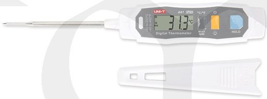 A61 je teploměr s krytím IP65 s nerezovou sondou a certifikací FDA. Je vybaven ochrannou skořepinou, která zabraňuje náhodnému propíchnutí a spálení kůže. Díky designu podobnému peru, jasnému podsvícení displeje a funkcím automatického vypnutí je A61 užitečným nástrojem pro měření teploty pro vaření, chlazení, topení, zpracování potravin a další aplikace.