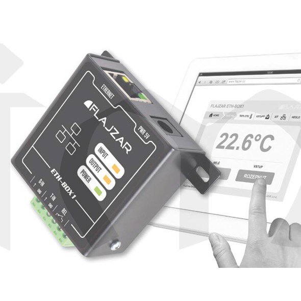 Malý ethernetový komunikátor umožňující pohodlné ovládání libovolného zařízení přes webové rozhraní. Ovládací prvky komunikátoru podporují dotykové displeje - snadné ovládání např. z iPad, iPhone a dalších tabletů. Možnost připojení externího teplotního čidla (součástí dodávky), vybaven univerzálním digitálním vstupem (zapnuto / vypnuto, otevřeno / zavřeno) a relé výstupem.