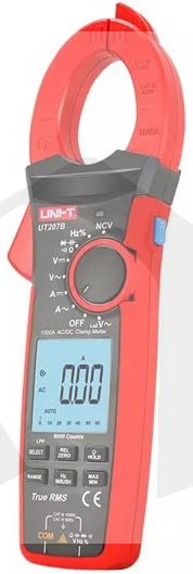Digitální klešťový měřič UT 207B slouží pro měření střídavých a stejnosměrných napětí do 1000V, AC a DC proudů do 1000A a frekvece u nízkého napětí (nn) do 1000V a proudu do 1000A v rozmezí 40Hz až 400Hz a u malého napětí (mn) 10Hz až 1MHz. Na všech rozsazích má ochranu před větším napětím než 1000V a zvukový a optický alarm. Čtyřmístný více segmentový displej o rozměru 43 x 45 mm se zadním podsvícením a rychlou obnovovací frekvencí (3krát/s). Maximální zobrazitelná hodnota je 6000. Displej obsahuje analogovou 31 dílkovou stupnici (bar graf). Rozevření čelistí umožňuje měření na kabelech o průměru až 42mm. Bezkontaktní snímání elektrického pole (NCV) umožňuje detekovat vodiče pod napětím. Přiložená sonda - kryt hrotů na testovacích kabelech umožňuje měření na rozvodech nn v kategorii CAT III bez nebezpečí vzniku oblouku. Bez krytů na hrotech lze měřit testovacími kabely jen na rozvodech nn kategorie CAT II (například zásuvky 230V). Snímačem je citlivá Hallova sonda. Možnost dokoupení pružné smyčky pro měření proudů až do 3000A. Napájecí baterie 3ks 1,5V R03. Příkon měřiče je cca 1,8 mA. Přístroj má funkci automatické úspory energie - po 15ti minutách přechází do režimu spánku, kdy má spotřebu jen <50μA, což účinně prodlužuje životnost baterie. Funkci úspory energie lze vypnout.