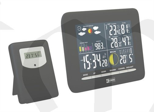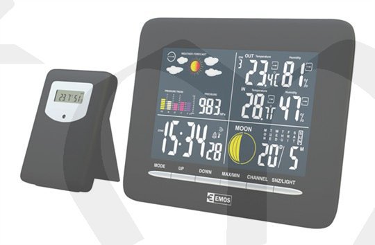 Hodiny řízené rádiovým signálem, 2 budíky s funkcí snooze, vnitřní a venkovní teplota a vlhkost, záznam max/min teploty a vlhkosti, fáze měsíce, podsvícený displej.