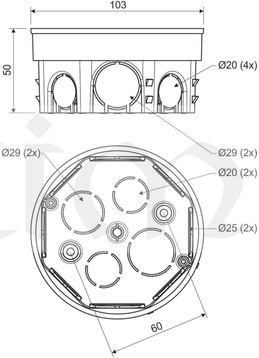 Kovová kruhová deska, plastová krabice a dvojice vrutů 3,5x35 se zápustnou hlavou (pozink).