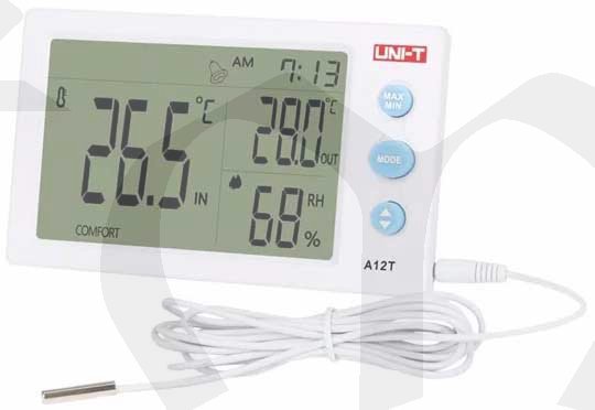 Digitální teploměr s vlhkoměrem A12T slouží k měření vnitřní teploty a vlhkosti a zároveň i vnější teploty. Na rozměrném displeji zobrazuje kromě naměřených hodnot také čas s možností výběru 12h a 24h režimu a funkcí budíku. Na základě vnitřní teploty a vlhkosti umí vypočítat hodnocení komfortu, které je také uvedeno na displeji.